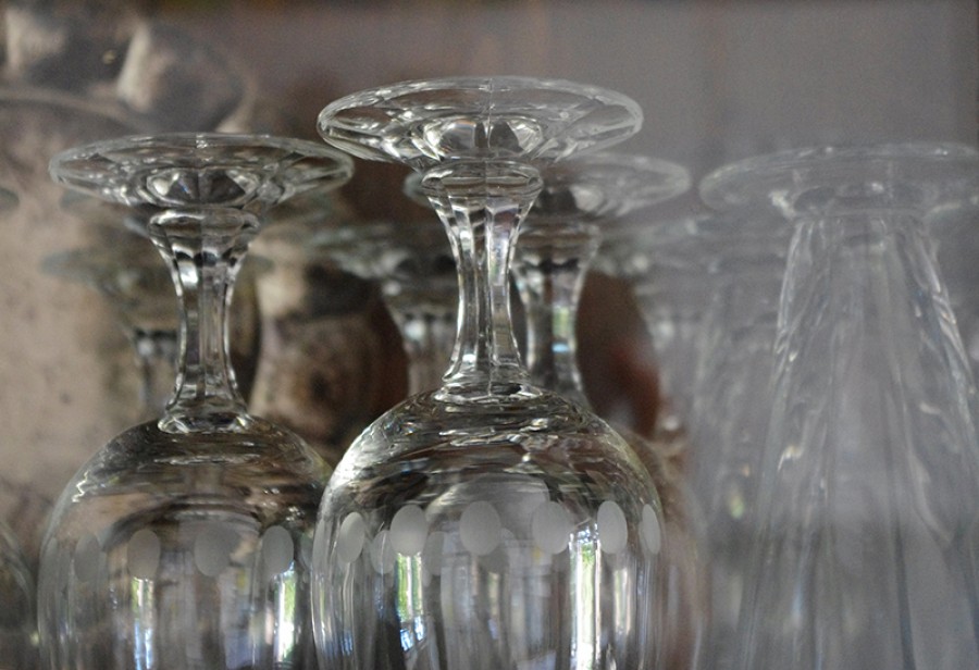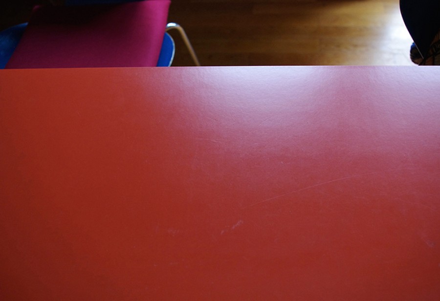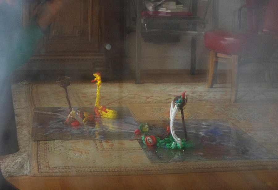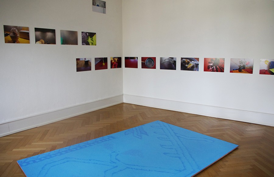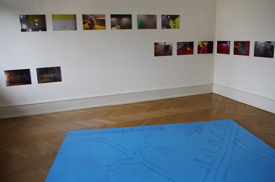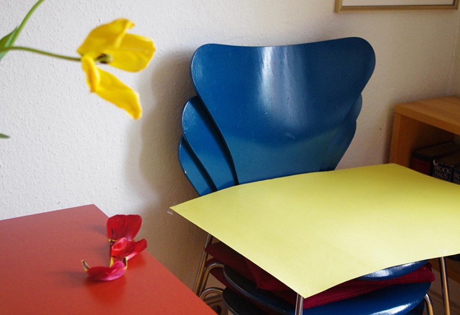 blaue Stapelstühle, roter Mohn, gelbes Papier, Gläserformationen, eine Fliege,