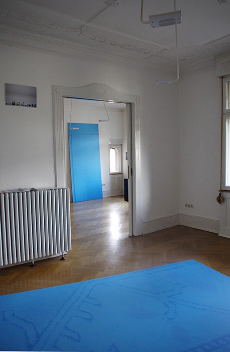 diesmal installativ im Raum: Zwei große blaue Bildflächen als Mitspieler lassen