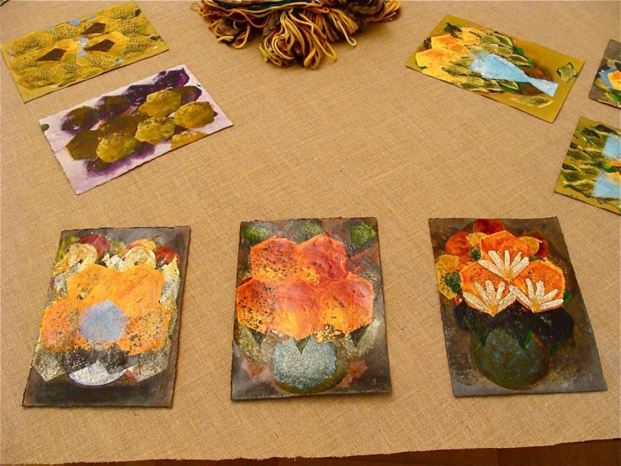 Die einzelnen Papier-Arbeiten sind Teile einer großen Arbeit auf Leinwand, die wiederum das Hexagon aufnimmt.