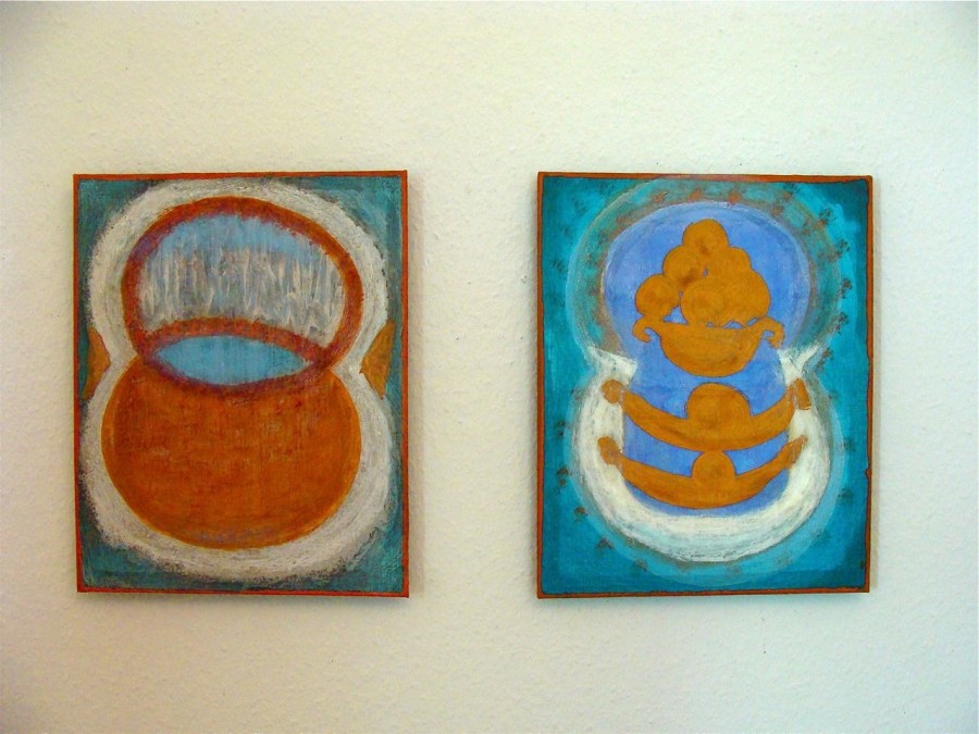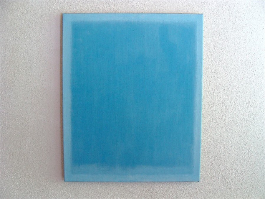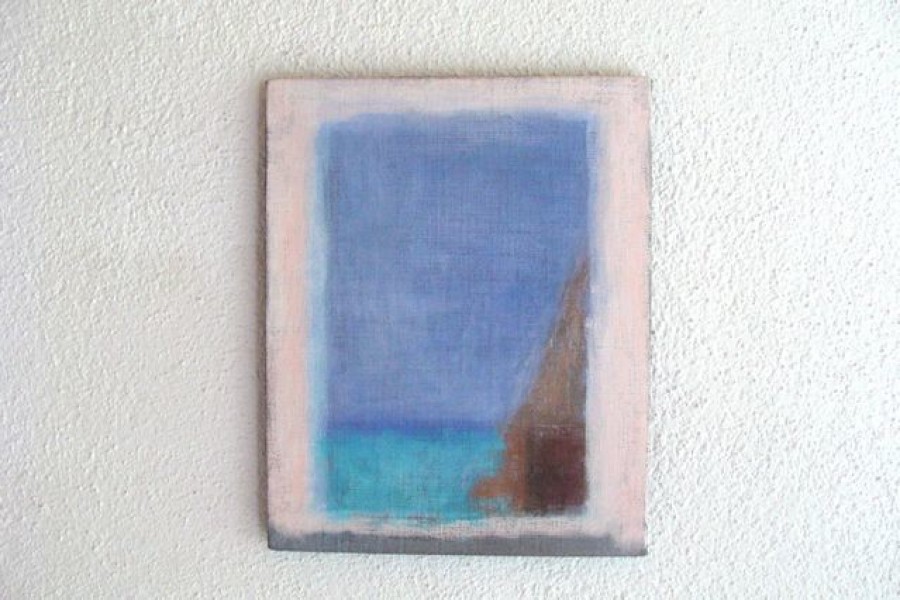 Dann gibt es die „mediterranen“ Arbeiten, entstanden bei Aufenthalten um Hydra herum mit ihrer Hymne auf das Blau von Himmel, Wind und Wasser. Hier spürt man am deutlichsten, dass für JE wie für den von ihm außerordentlich geschätzten Paul Klee gilt: „Die Farbe hat mich“. Neben der Farbe tritt hier auch stark der skulpurale, composithafte Charakter der Werke hervor. Zusätzlich zum Augen-Sinn wird ein taktiler herausgelockt, und es gibt oft auch so etwas wie ein Bildgeschehen. Die Titel der Arbeiten öffnen weitere Horizonte, sind mit Bedeutung aufgeladen, aber offen genug, mit anderer Bedeutung gefüllt zu werden.