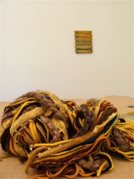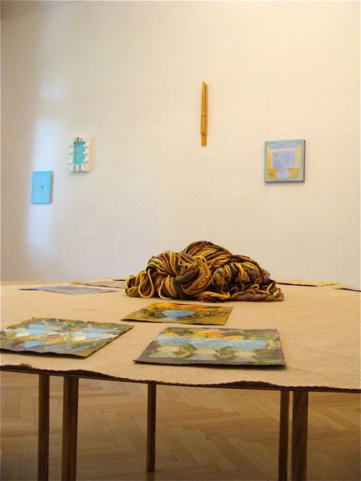 JEs Koordinatensystem ist weit gespannt. In dieser Ausstellung schließen sich drei Werkgruppen zusammen: Am weitesten in Raum und Zeit hinein reichen die Arbeiten, bei denen auf additive Art und Weise bemalte Latten zu Farbklängen komponiert werden. Dahinter steht auch der Themen-Komplex um Behälter, Speicher, Kollektor, der als Bestandteil der Entstehungsgeschichte sein Werk durchzieht. JE spricht auch von sich als „vessel“, in dem Erfahrungen gesammelt werden.