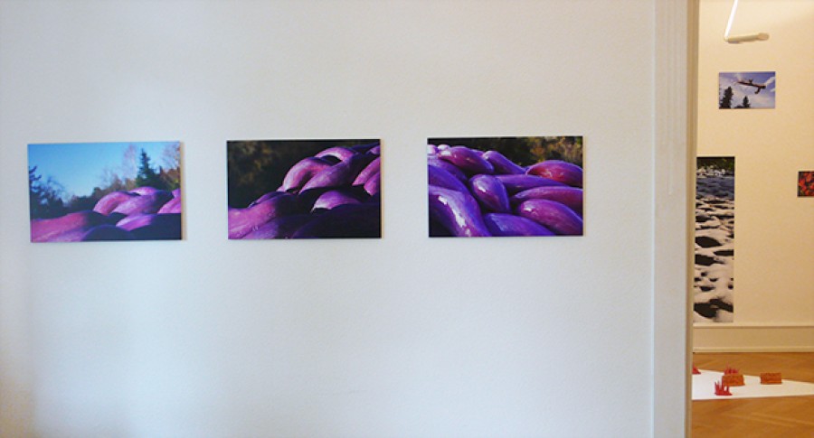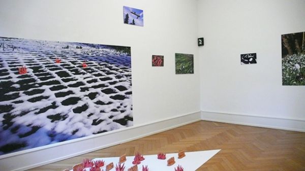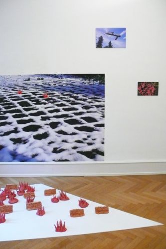 Die fotografische Arbeit „Rotes Gras“ erfährt eine installative Erweiterung in den Galerieraum hinein, welche die grafische Struktur des Fotos und die skulpturalen Mitspieler in ein neues Bezugssystem stellt. Die Schwarmbewegung der Stachelwesen wird gestoppt, AM gebietet mit kleinen Mäuerchen Halt. AMs Dialog-Arbeiten sind oft auch auf Polarität angelegt. Sie spielt ebenso mit Analogien wie auch mit Oppositionen, verwendet gern den Begriff „Gegenspieler“ anstelle von „Mitspieler“.