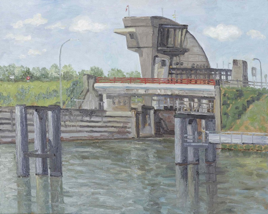 Die Sachlichkeit von Motiv und Malweise wird unterlaufen, indem HR fast alle Konstruktionen noch einmal als Spiegelbild im Wasser des Rheins aufnimmt. Die Statik gerät in Bewegung. Das Monumentale löst sich auf.